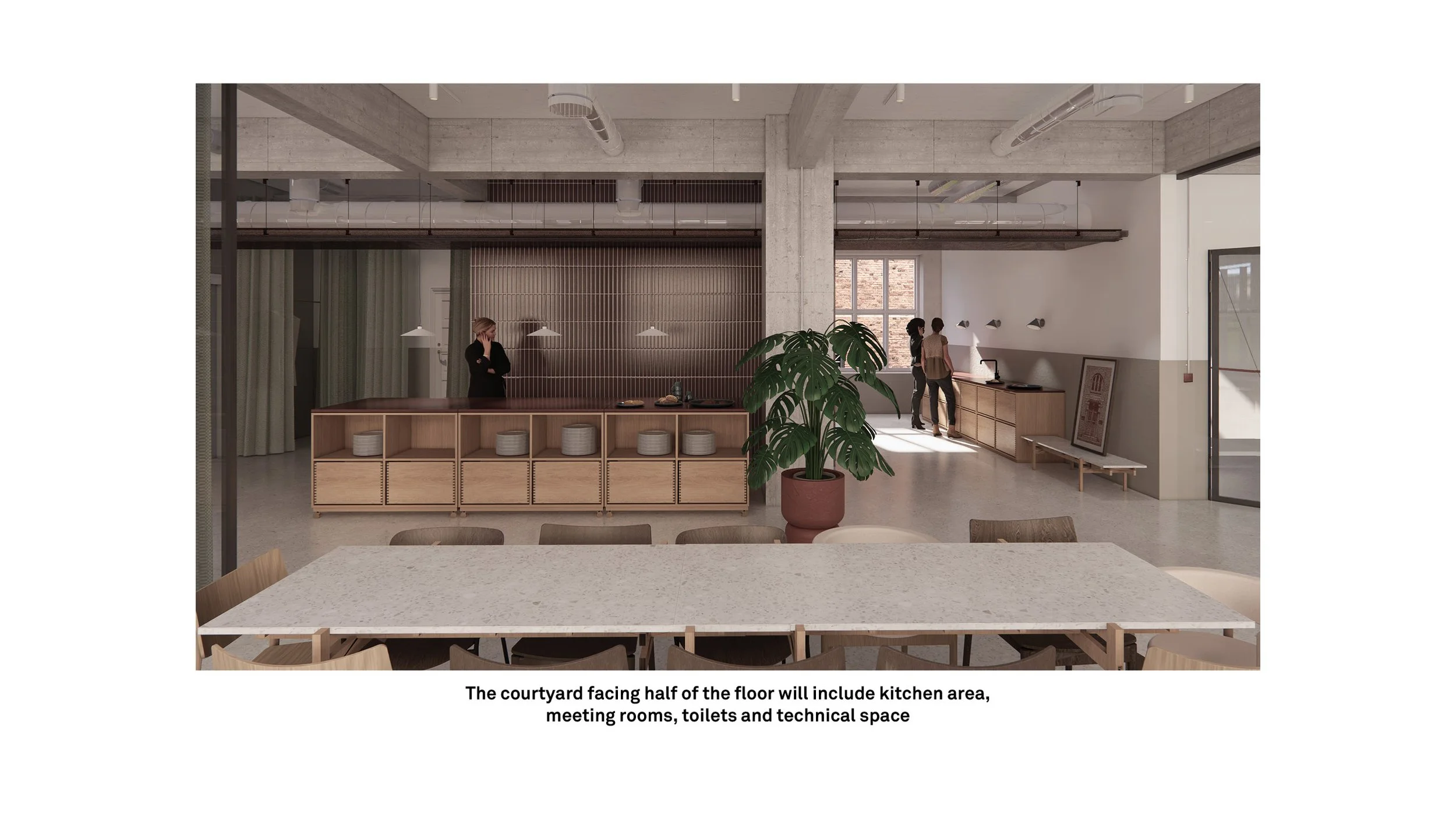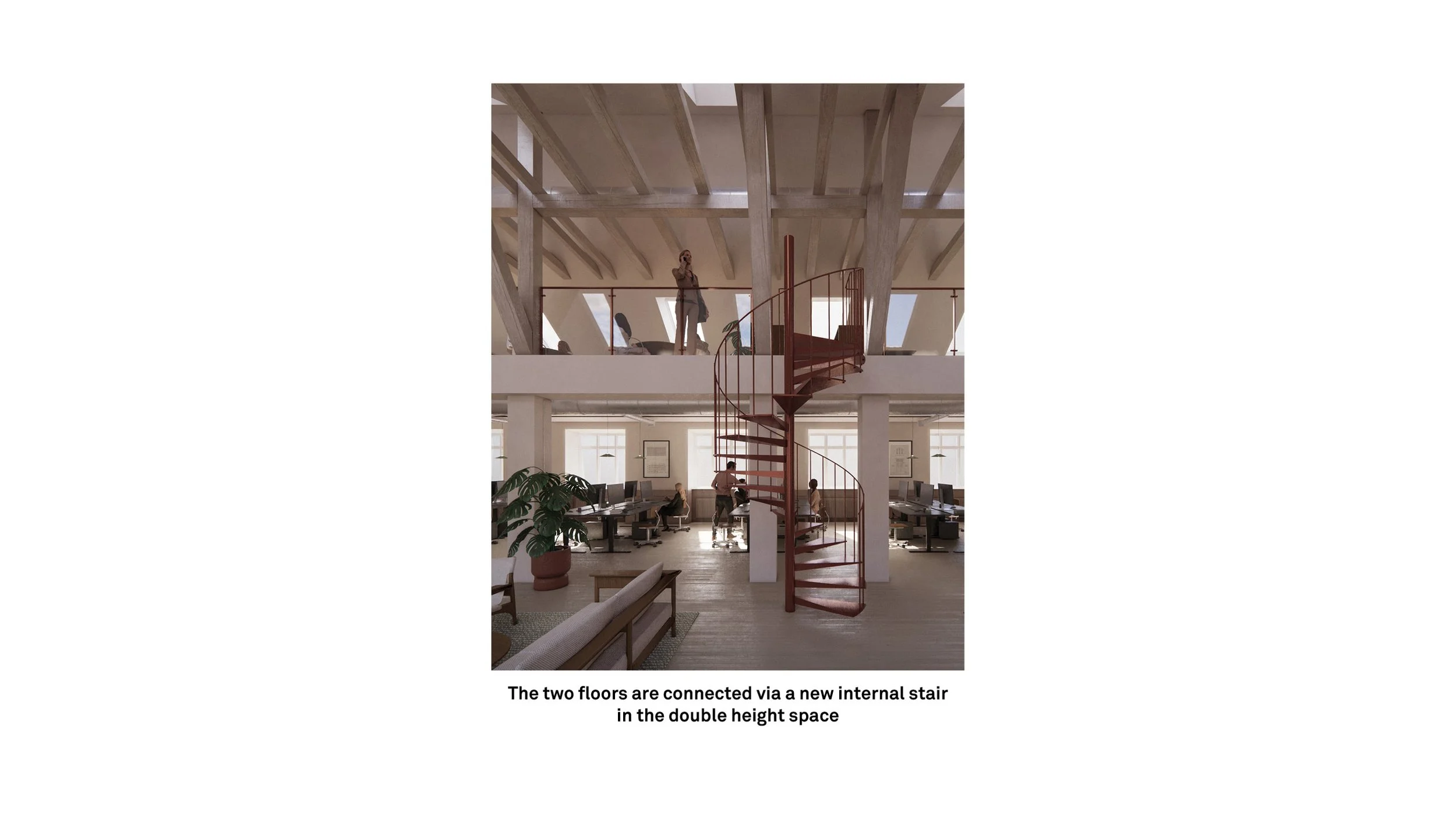 The renovation focuses on optimizing space utilization and improving circulation, with a particular emphasis on reinstating the building’s identity as a printing house. This entails highlighting its industrial heritage through interior design and material choices, preserving and repurposing architectural and structural elements, and adopting sustainable practices by reusing materials wherever possible.